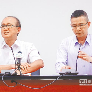 经过9小时讨论,台当局“教育部次长”林腾蛟(左)、“义务教育署署长”邱干国举行记者会,说明最终决议高中语文文言文比例订为45%至55%,维持原案。(图片来源:台湾《中时电子报》)