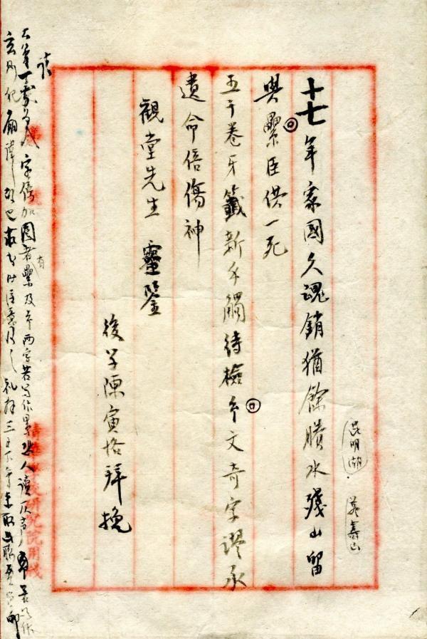 展览中一件陈寅恪手札是1927年王国维自沉于昆明湖以后,陈寅恪写给王国维的挽联,上书“十七年家国久魂消,犹余剩水残山,留与累臣供一死;五千卷牙签新手触,待检玄文奇字,谬承遗命倍伤神。”后面则有“观堂先生灵鉴,后学陈寅恪拜挽”陈寅恪写在清华学校研究院专用的红格八行笺上,纸上红色的行格也已模糊,陈寅恪的字墨浓淡相间、清晰易辨识。
