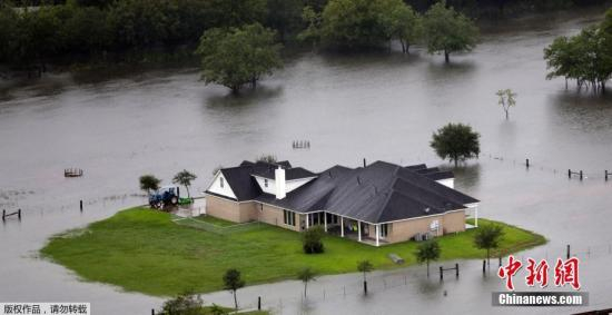 资料图:飓风“哈维”给美国休斯敦带来强降雨,城区及周边区域洪涝严重。