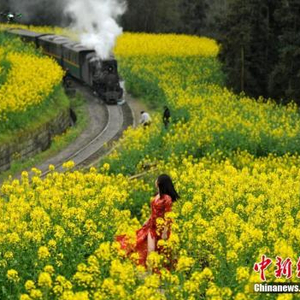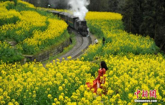 资料图为穿越油菜花海的蒸汽小火车。中新社记者 刘忠俊 摄