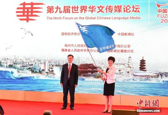 9月11日,中共福州市委常委、宣传部长蔡战胜将世界华文传媒论坛会旗交接给河北省石家庄副市长孟祥红手中,第十届世界华文传媒论坛将于2019年9月在河北省石家庄市举办。中新社记者 王东明 摄