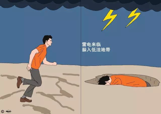躲避雷电的安全区域是低洼地和森林。危险迫在眉睫时,采用防雷击姿势进行躲避。