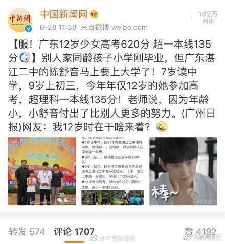 第一个是12岁的天才少女陈舒音,今年高考以超出一本线135分的成绩,被浙大医学试验班(5+3)录取,这样计算的话,读完博士她才20岁,前途一片光明,而很多人20岁只是刚上大学。