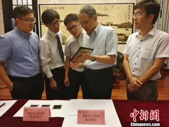 图为韩礼元教授与研究团队在介绍钙钛矿太阳能电池模块。许婧摄