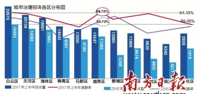 关于城市治理类投诉各区分布情况,《报告》显示,白云区投诉量最大,总数为22670宗,而投诉增长率最高的区域是黄埔区、增城区、花都区、从化区。其中,黄埔区增长量达142%。对投诉后的满意度调查显示,上半年整体满意度64.43%,较去年同期增长了3.98%。越秀区的满意度最高,为69.72%。
