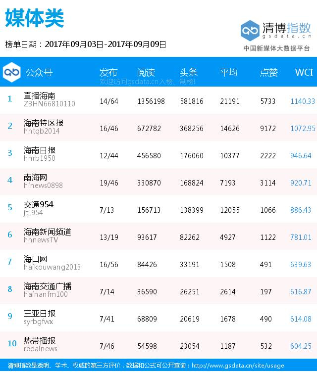 “海南微信影响力排行榜”由南海网新媒体联合清华大学新闻研究中心权威发布。本榜单数据来源于第三方平台新媒体指数大数据平台http://index.xuetang.cn/,南海网新媒体仅整理发布,如若因第三方平台等任何原因出现数据错误现象,本网对其概不负责,亦不承担任何法律责任。
