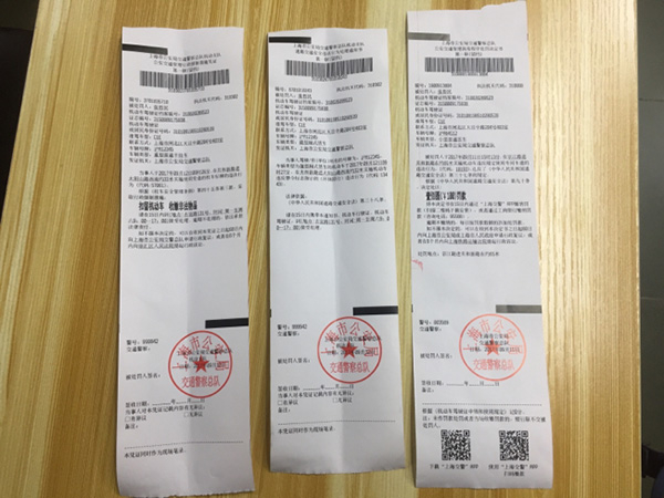 除了处罚决定书(右),强制措施凭证(左)和违法处理通知书(中)并不能扫描二维码支付,需前往交警指定窗口。澎湃新闻见习记者 李佳蔚