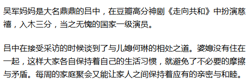 2015年何琳怀孕,老公吴军也随之曝光。吴军出身名门,现在是北影的副教授,也做编剧和导演工作,《智取威虎山》就出自他手。才子佳人,着实般配。
