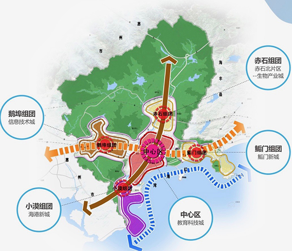 深汕特别合作区的发展规划可归纳为“两轴、一带、一中心、四组团。”