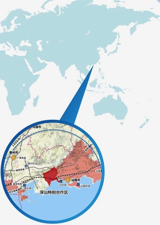 深汕特别合作区位于广东省汕尾市海丰县,与惠州市惠东县接壤,距广州200公里、深圳60公里、汕头200公里,距香港82海里,距台湾高雄港200海里。深汕特别合作区规划范围包括汕尾市海丰县鹅埠、小漠、鲘门、赤石四镇,总面积468.3平方公里,可建设用地145平方公里,海岸线长42.5公里,目前户籍人口76565人。