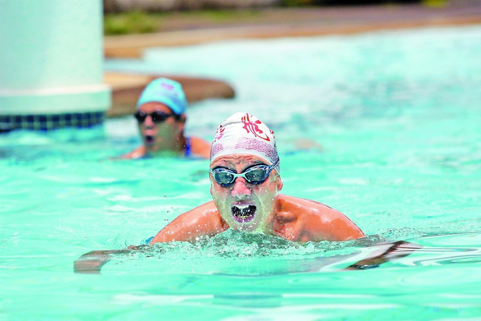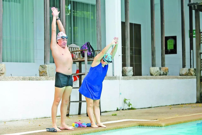 换好泳装的刘明益身材高大,头发花白,因为习惯蛙泳,背部比其他部位都晒得黑一些。他带着妻子在池边做了热身运动,妻子比他先一步下水,但他只需划蹬两下,就远远将妻子抛在了身后。于是,还未有其他客人的泳池里,只有夫妻俩一快一慢舒畅地游着。