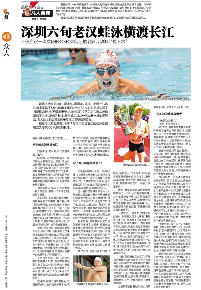 说起游泳,要追溯到童年时期。刘明益生在江西南昌,赣江就从家门前流淌而过。小时候,他几乎每天都跟着村里的孩子们一起下江玩水,渐渐摸索出了一套狗刨式的泳姿,倒也自得其乐。可是长大后,无论是在南昌,还是转到深圳工作,几十年来,刘明益却很少再下水了,与朋友们相约活动,也不会选择游泳。