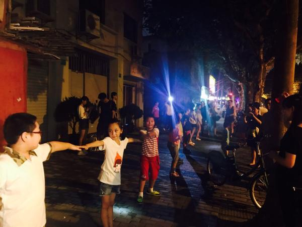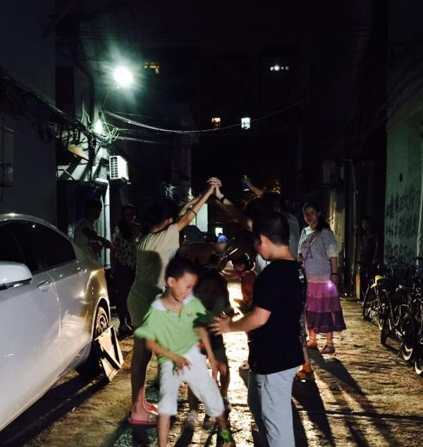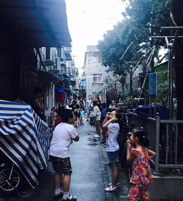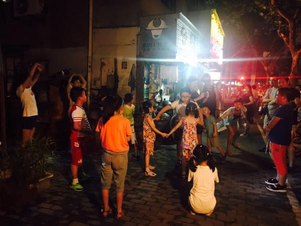 本以为这是个80后的怀旧游戏,却没想到一提出来斌斌就说他们也在玩,从内江路出来右转再拐进定海路449弄小区里玩起了这个游戏。大家手搭手连城大桥,行程在欢乐的童谣里继续。