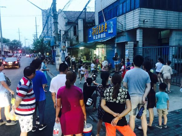 出了449弄就到定海路,两边都是菜店,穿过菜场就到了定海港路最东边的入口,这里大家静静地聚在一起,追着小巷里打出的光点,大家的小手被灯光照亮。