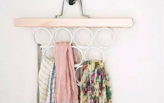 安装简易窗帘时使用的吊环,也能让一个普普通通的衣架功能升级。你瞧!有了这些吊环,围巾、丝巾再多也不怕,统统都能挂起来,不占空间还方便拿取。