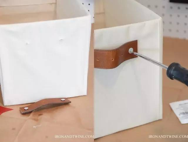 然后用旧皮带制成收纳箱提手,固定在纸箱两侧。并可在纸箱外侧的布料上画上装饰条纹,或是用碎布简单装扮一下。