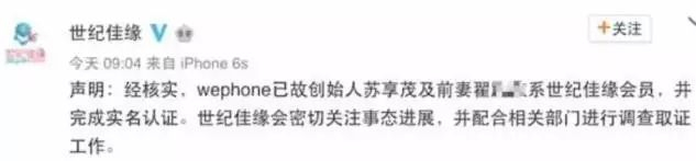 此事件一出,世纪佳缘发布声明称,经核实,WePhone已故创始人苏享茂及前妻翟某某系世纪佳缘会员,并完成实名认证。世纪佳缘会密切关注事态进展,并配合相关部门进行调查取证工作。
