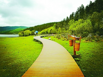 同行的工作人员告诉我,这里的旅游设施都是考虑了生态与环保的。比如游客木栈道,设计上采用钢架悬空修建,尽量避免对景区生态的破坏,用避让或包容的方式对待树木,从而确保了景区建设与自然的和谐共融;已建成的十多个环保公厕,多数采用光电感应式自动打包完成粪便的处理,经统一回收后,运出园外进行无害化处理。