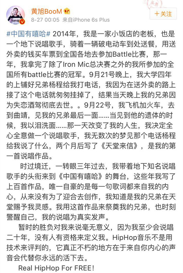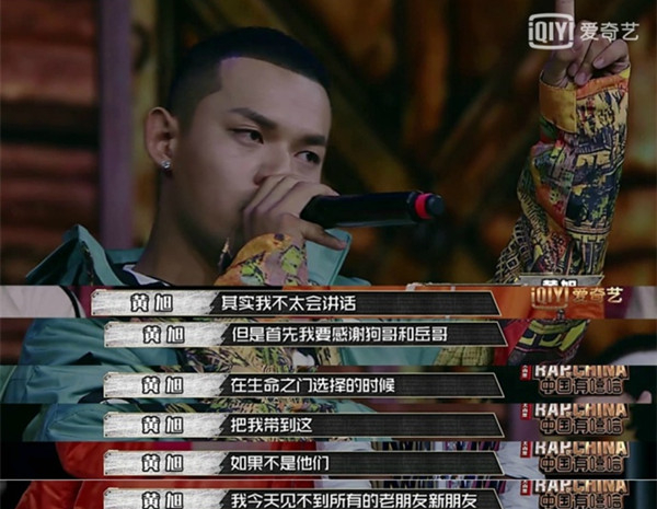 黄旭在淘汰那场里,唱了悼念已逝好兄弟的《天堂来信》,这是他刚玩嘻哈时写的,整首歌讲了个完整故事,他无奈悲痛于没有接到好友去世前打来的最后一通电话,因为当时正忙于给自己的小饭店送外卖。彼时黄旭还下不了决心做全职rapper,认为那样养不活自己和小家。