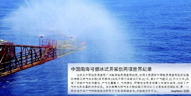 经过整整60天的运行,南海天然气水合物(即可燃冰)试采7月10日关井,蓝鲸I号钻井平台目前已经回到母港—烟台。据悉,本次试采累计产气超过30万立方米,首次取得了持续产气时间最长、产气总量最大、气流稳定、环境安全等多项重大成果,创造了产气时长和总量的世界纪录,标志着我国成为全球第一个实现在海域可燃冰试开采中获得连续稳定产气的国家。