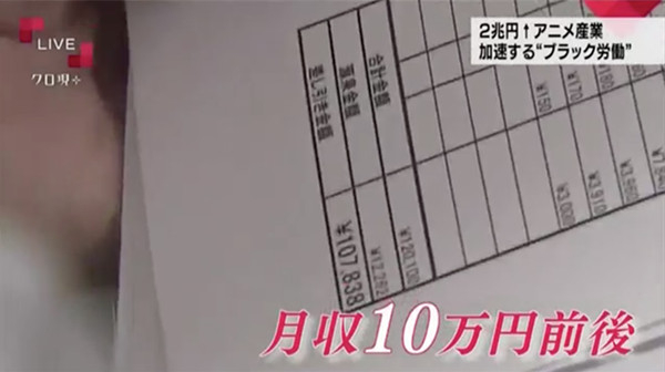 NHK节目中采访的原画师25岁,原画的工作加上打零工年收入100万日元(约6万元人民币),住在非盈利组织提供的月租2.5万日元(约1500元人民币)的宿舍中,虽然说着“我是因为热爱才选择的这个工作”,但又不乏失落地讲到“动画师中能结婚的只有最顶层的二成。必须要放弃一些东西……做动画师就要牺牲很多东西”。