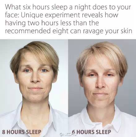 来看一张恐怖的对比图!据《每日邮报》报道,46岁的Sarah Chalmers参加了英国伦敦的一个睡眠学校的实验,连续五天只睡6个小时与睡满8个小时的面容对比照(如下图)。