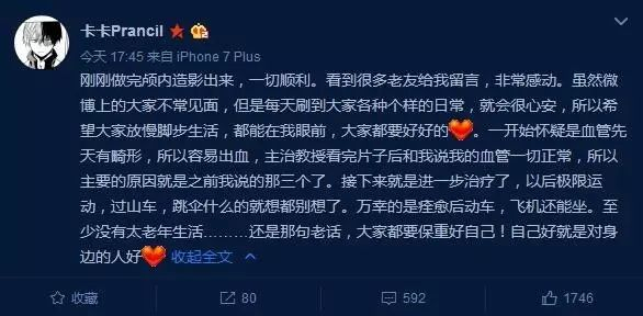 万幸的是,po主通过微博表示,自己一切顺利,还要进一步治疗。