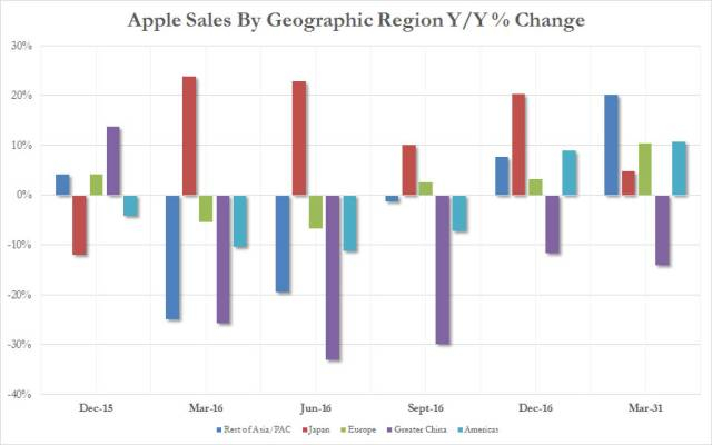苹果公司2017财年第三季度财报显示,苹果当季营收为454.08亿美元,同比增长7%,净利润为87.17亿美元,同比增长12%。在营收、净利双增长的同时,苹果在大中华区却迎来了连续6季度下滑。