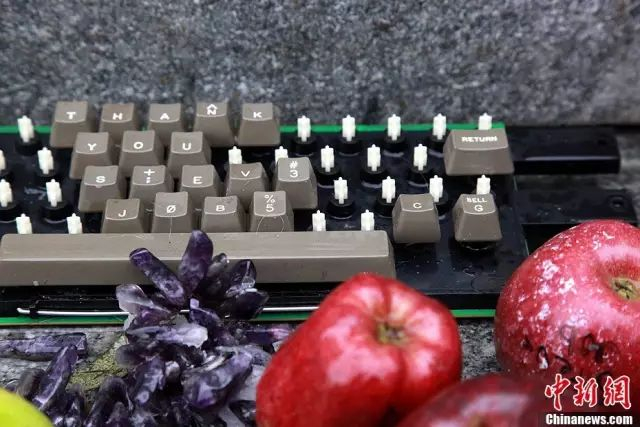乔布斯辞世后,有苹果迷献上一个老式键盘,键盘上只留下拼成“谢谢你乔布斯”的数行英文键。中新社发 孙宇挺 摄