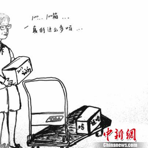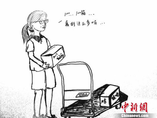 另一幅画作展现的是同组女志愿者搬水时“狼狈”的场景。“小爱特”们搬水进入场馆前要经过长长的楼梯,推车无法上去,只能靠人工扛,这对女生来说会有些吃力,陈碧璐就将她们抗水时的场景记录了下来。“后来大家看画时看到自己‘丑萌’的样子都觉得很搞笑,闲暇之余这也算是我们的一种娱乐方式,开开心心的工作大家也就不太在意搬那沉重的箱子时的苦累了。”陈碧璐说。