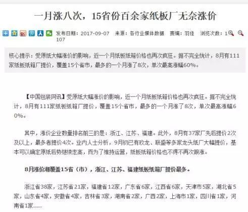 纸价效应传导到的下游包装企业里,不少单位因无法承受,纷纷挂出纸箱、纸盒的销售调价通知,而很多淘宝店铺的卖家也正在承受快递纸箱涨价的成本压力;甚至在一些零售店和超市里,部分卫生纸产品的单价已初露端倪,比三个月前上涨了1-2毛。