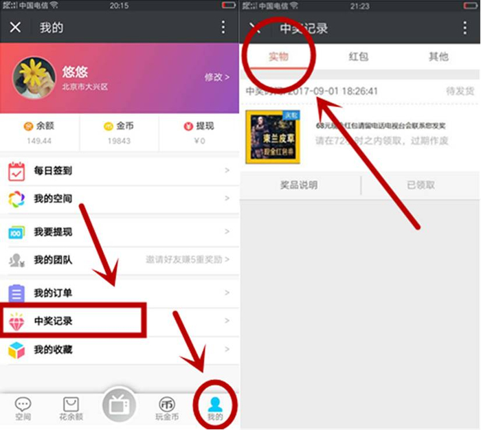 在“欢乐七点”社区右下角的“我的”—“中奖记录”—“其他中奖”—“实物”中领取。提交个人信息,领取之后点击“我知道了”,页面显示“已领取”,就表明领取成功了。68元现金红包等待工作人员联系您,给您发专属发放就好啦!