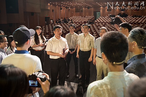 刘伟在观看话剧后亲切慰问演职人员,他对话剧的成功演出表示祝贺,对全体编创、演职人员的投入付出表示感谢。他指出,《吴玉章》作为一部人大学生自己创作排演的原创话剧,融入了同学们的艺术激情与创作热情,融入了同学们对学校的深厚感情和对学校精神的传承,是一部打动人心、充满敬意的剧目。中国人民大学最根本的特点就是“始终与党和国家同呼吸、共命运”的“红色基因”,其重要源头就体现在吴玉章老校长为代表的老一辈革命家、教育家身上,吴玉章老校长崇高的精神品质、伟大的人格魅力需要一代又一代人大青年始终铭记于心,自觉传承弘扬。