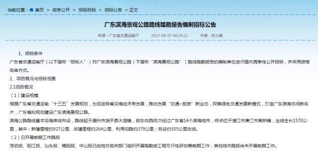 近日,省交通厅发布招标公告,对广东滨海景观公路工程的前期路线踏勘报告进行招标。