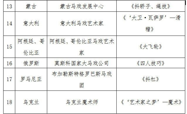 本届杂技节将有来自巴西,乌克兰,美国,西班牙,瑞士,法国,俄罗斯,埃塞俄比亚,蒙古,意大利,阿根廷,哥伦比亚,罗马尼亚,匈牙利,瑞典,朝鲜,中国、中国台北等18个国家和地区31个节目参赛。