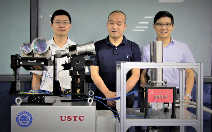 团队成员窦贤康(中)、上官明佳(左)、夏海云(右)与双频超导测风激光雷达