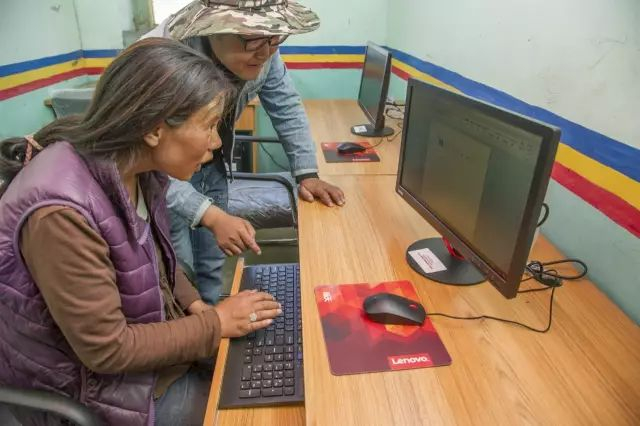 ☘ 在刚完成的“世界海拔最高村华商报读者多媒体室”里,推瓦村妇女主任抓紧时间让村里的大学毕业生曲尼多吉教她打字