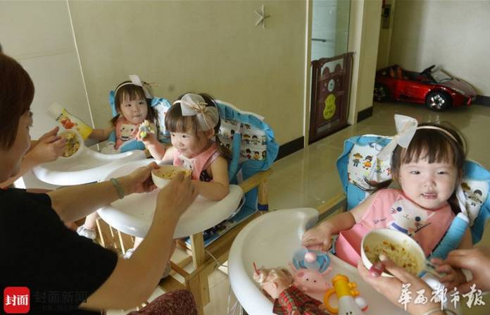 9月12日,刘曦可爱的三胞胎女儿正在吃饭。雷远东 摄