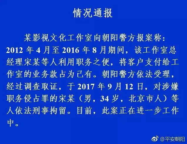 王宝强前经纪人宋喆因涉王宝强离婚案相关问题于近日被警方抓获,罪名可能是涉嫌职务侵占。据悉,宋喆自9月11日始便被警方控制。