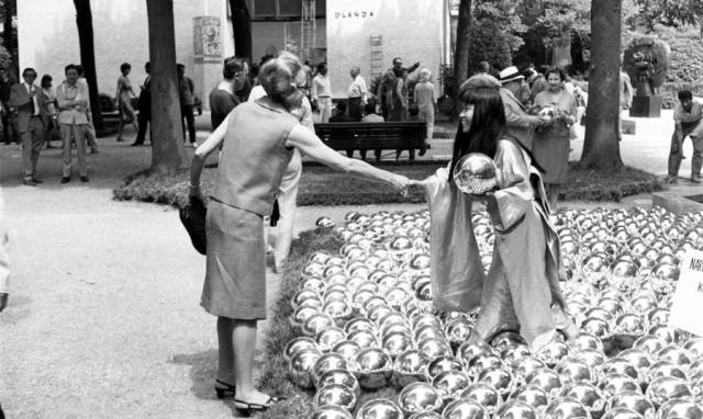 1966年,她带着作品《自恋庭园》↓↓在未受官方邀请下“自行参加”了第33届威尼斯双年展。在展馆的户外草坪上,草间弥生穿着金色和服端坐在1500个不锈钢球上,每颗球以两美元的价格向观众出售。
