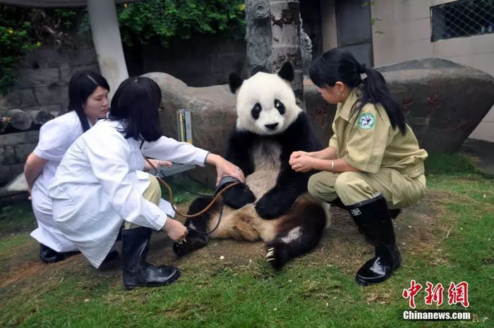 图为2010年6月23日,已近“百岁”的大熊猫明星巴斯正在福州熊猫世界接受医务人员测量血压。23天前,“巴斯”突然病危,经各方努力终于再次续写了生命奇迹,现已度过危险期,这算得上是“巴斯”的第三次新生。中新社记者 张丽君 摄