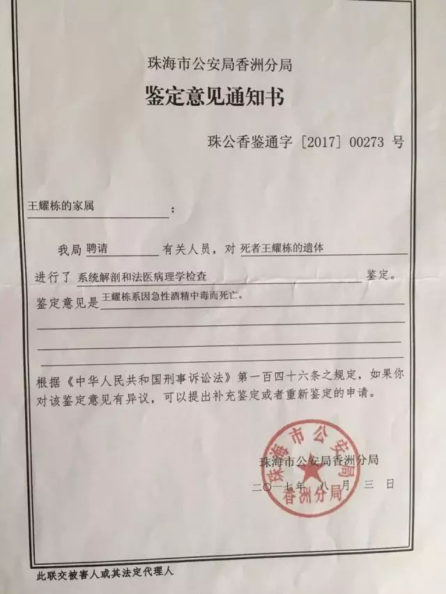 珠海市公安局香洲分局出具的鉴定意见通知书称,这个19岁的年轻人死于“急性酒精中毒”。
