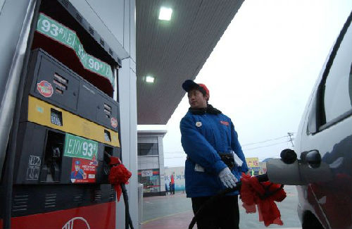 2005年12月28日,在石家庄市一个供应乙醇汽油的加油站,一名工作人员正在为一辆车加油。 新华社记者巩志宏摄