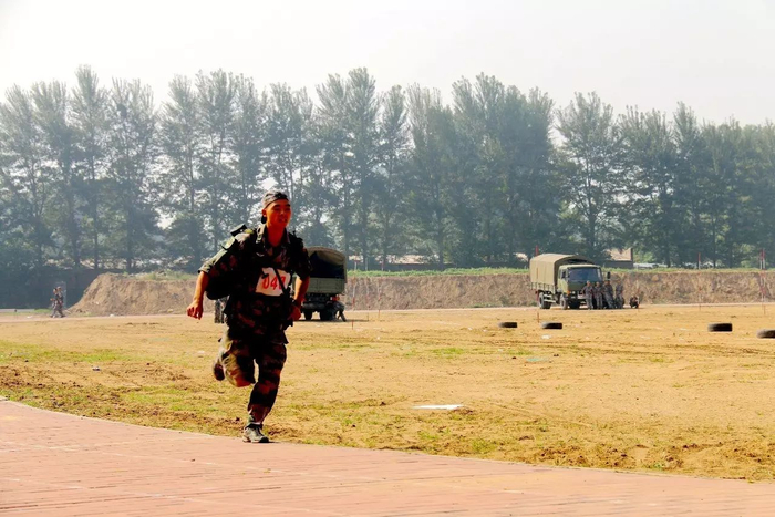 比赛开始,战术、4×400米负重跑、轻武器分解结合、手榴弹投准、4×400米负重跑、戴防毒面具100米跑、100米障碍,唐辉一直遥遥领先。最后一个4×400米,他步伐稳健,大步朝前。