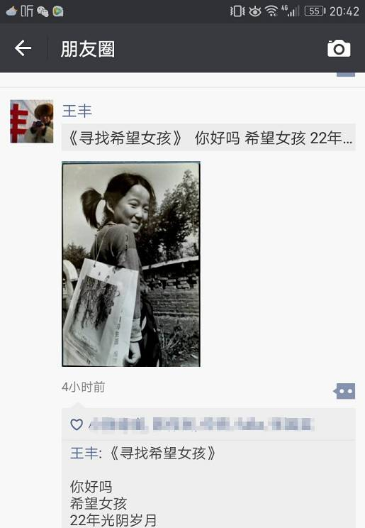 13 日下午,王丰老师又在微信上写下了这首名为《寻找希望女孩》的小诗,想要再见一见,22年前在双城一所小学里拍摄过的“生活报希望女孩”。