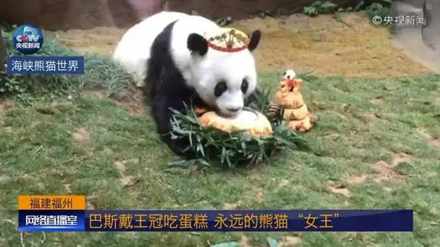 △饲养员为巴斯带上了王冠。饲养员们手拿着巴斯世界最长寿的圈养大熊猫的认证书,和巴斯合影留念。