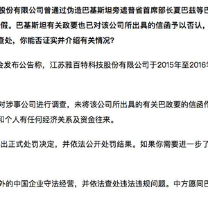 而据外交部9月4日披露,经证监会联合巴基斯坦有关部门调查,雅百特所出具的有关巴政要的信函系伪造,也尚未发现证据证明该公司同巴境内公司和个人有任何经济关系及资金往来。