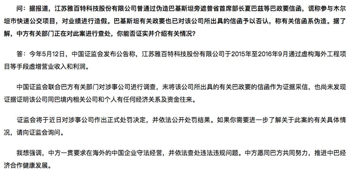 9月4日,外交部发言人耿爽在例行记者会上证实,A股上市公司雅百特(002323)曾通过虚构海外工程项目等手段,虚增营业收入和利润,并涉嫌伪造巴基斯坦政要信函,证监会将于近日对涉案公司作出正式处罚决定。