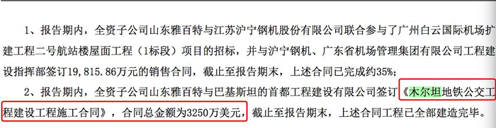 雅百特在2015年报中提及,公司全资子公司山东雅百特与巴基斯坦的首都工程建设有限公司签订《木尔坦地铁公交工程建设工程施工合同》,合同总金额3250万美元(约合2.12亿元人民币)。