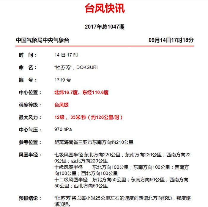 琼州海峡、海口近海海面及北部湾北部海面风力8~10级;北部湾南部海面,本岛东部、南部和西部海面风力10~12级,其中“杜苏芮”中心经过的附近海面旋转风12~14级、阵风15~16级;